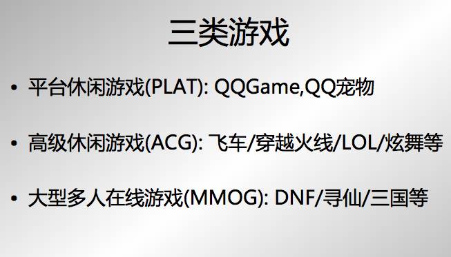 腾讯互娱有三类PC端游戏:1. 平台休闲游戏,比如QQGame斗地主、QQ宠物;2. 高级休闲游戏,因为游戏实时性要求增高,对用户需要就近接入,这类游戏会进行分区处理;3. 大型多人在线游戏MMOG,这类游戏玩法比较复杂,可能包含上万个任务,道具信息,逻辑很复杂,实时性要求更高,对应单用户数据量也会变得更大,新的MMOG游戏或者运营时间长的MMOG单用户数据量会达到几百K。手游这几年本身游戏内容不断的丰富,演进中的游戏分类基本也可以参考原先端游。