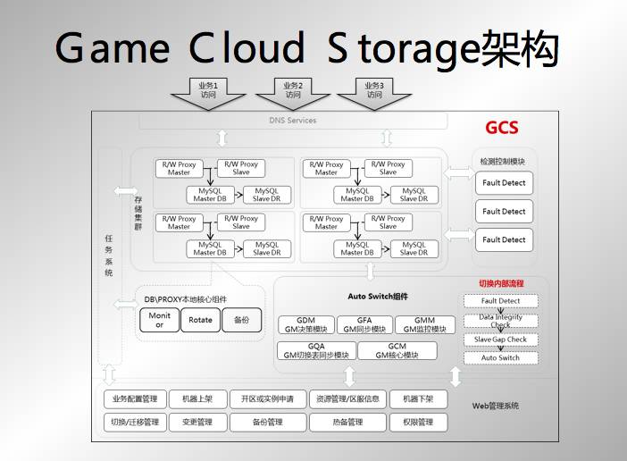 Game Cloud Storage主要解决硬件故障处理时间长,版本停机时间长,以及空闲率高这三个问题。mysql前增加了proxy一层做高可用;推出定制的tmysql,秒级在线加字段;以及将多实例管理变得更加方便,便于缩扩容。