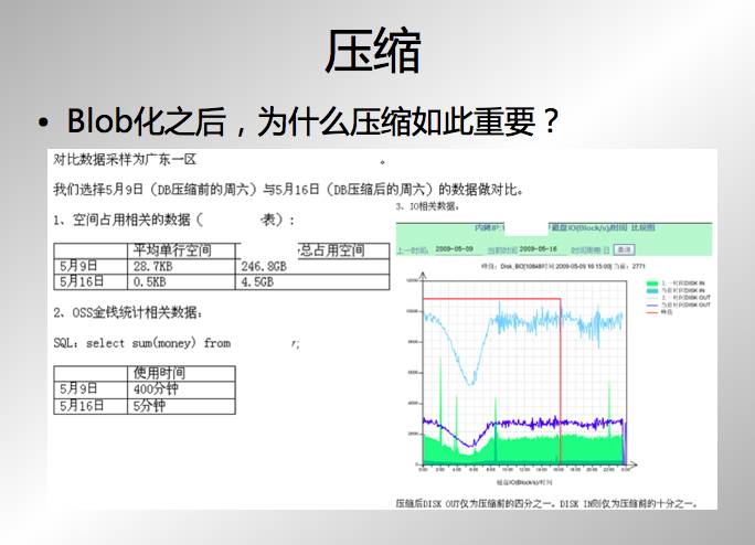 关于Blob我们遇到的一个问题是,当时比较火的《地下城与勇士》,上线刚半年单机数据量达到200多G。当时跑的硬件只是只有8G内存,6块SAS磁盘一台机器,一个周末因为夜间备份时间过长,到了白天还没结束,业务连续出了2个突发。后来,我们跟韩国的开发商商定了压缩这个投入最小的方案,通过一次停机,整体数据做一次压缩,整个数据库数据从200多G变成了4G。