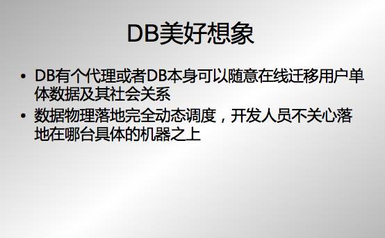 更新这个ppt之前,翻出来多年前内部分享的一页ppt,“关于DB的美好想象”,其中第一点因为牵扯业务过于多样化逻辑数据设计,还是没做到,第二点做到一点点。