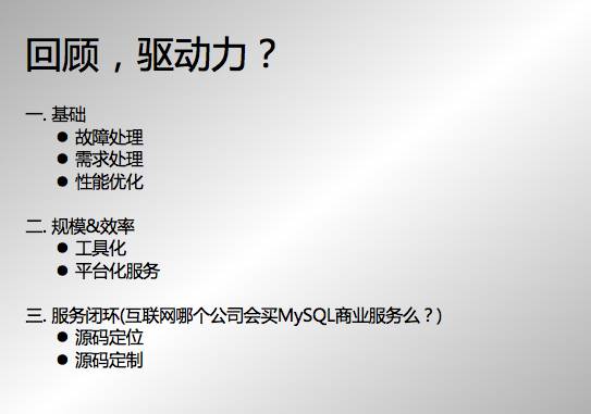 最近业界有很多运维发展方向的讨论,我自身也在思考运维的核心驱动力到底是什么。如果我去回顾过去的一些历程,我自己考虑运维核心的驱动力还是最简单两个字——问题。可能来自业务发展的快速增大数据量,请求并发增大,或者开发使用整个存储的容易程度,或者平时运维的一些问题,我们不希望自己那么多通宵处理故障,那么多步骤那么辛苦缩扩容。不管在哪家公司,只要我还能够不断解决问题,可能这个公司我还能呆得下去;如果没有问题需要解决,或者是天天时间都花在其他地方了,可能也就没什么意思了。