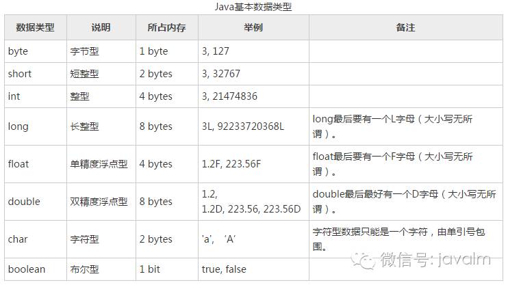 Java中共有8种基本数据类型,包括4 种整型、2 种浮点型、1 种字符型、1 种布尔型,请见下表。