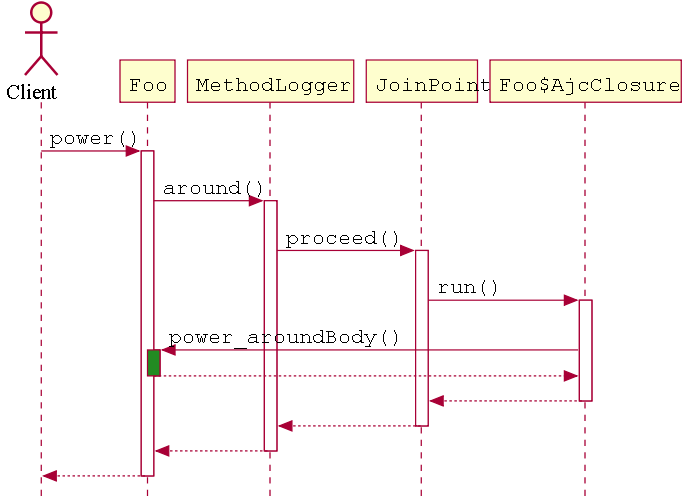 为了理解如何将不同的通知应用于对应的哪个方法,AspectJ织入在.class文件中使用了注解,并使用反射来浏览环境变量中的所有类。它分析@Around注解中的哪个方法满足条件。power()就在此时被发现了。