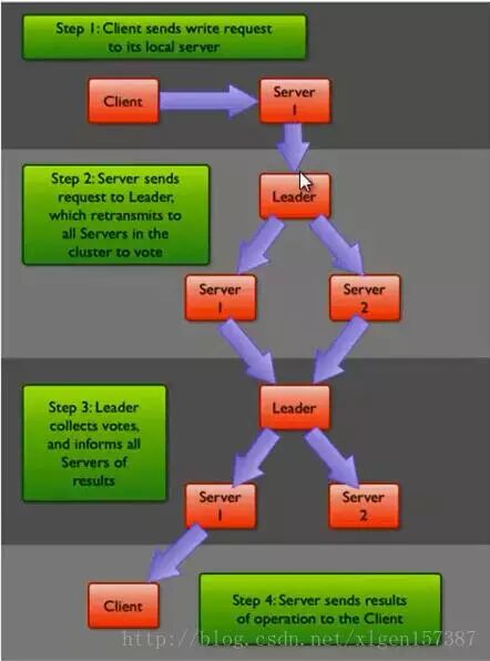 b)、如果Server1不是Leader,那么Server1 会把接受到的请求进一步转发给Leader,因为每个ZooKeeper的Server里面有一个是Leader。这个Leader 会将写请求广播给各个Server,比如Server1和Server2, 各个Server写成功后就会通知Leader。
