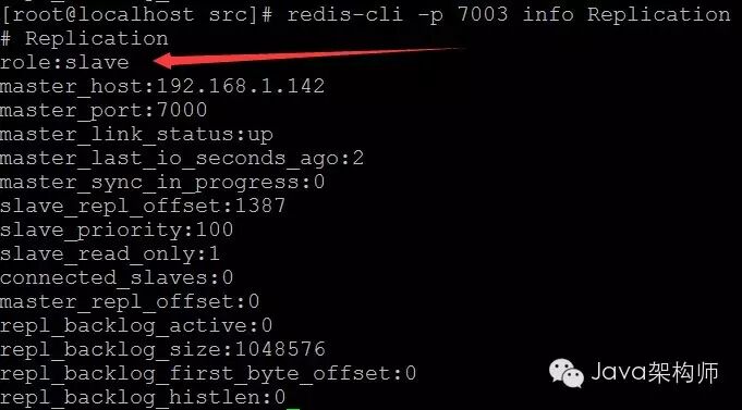 再执行redis-cli -p 7003 info Replication发现,该节点已设置成从节点。这些主从设置,都是在创建集群时自动完成的。