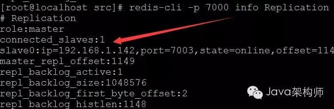 执行redis-cli -p 7000 info Replication 命令,观察7000这个节点,发现其复制配置信息已配置成主节点,并有一个从节点7003