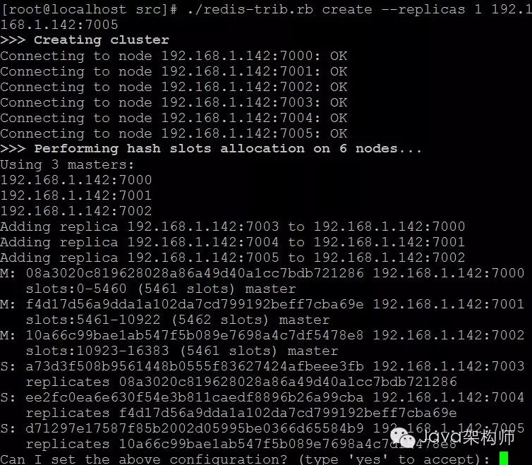 按提示敲入"yes",执行方案,将6个节点组成集群,3主3从。