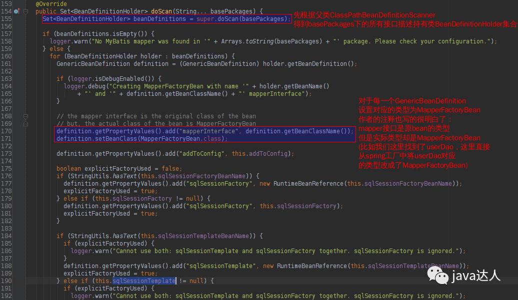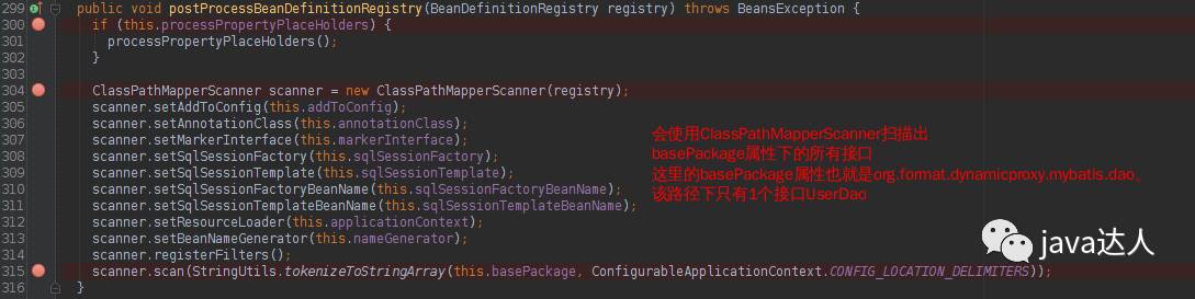 MapperScannerConfigurer实现了BeanDefinitionRegistryPostProcessor接口,BeanDefinitionRegistryPostProcessor接口是一个可以修改spring工长中已定义的bean的接口,该接口有个postProcessBeanDefinitionRegistry方法。