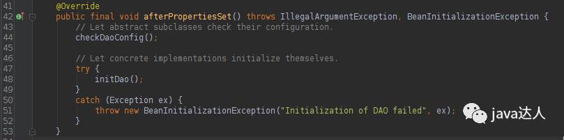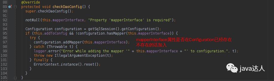 MapperFactoryBean继承了SqlSessionDaoSupport类,SqlSessionDaoSupport类继承DaoSupport抽象类,DaoSupport抽象类实现了InitializingBean接口,因此实例个MapperFactoryBean的时候,都会调用InitializingBean接口的afterPropertiesSet方法。