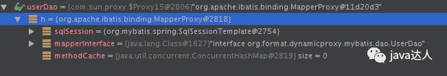 我们可以看到,userDao是1个MapperProxy类的实例。