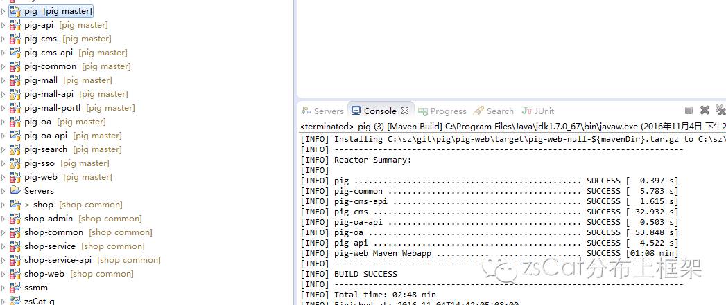 5) 待dubbo管控台和注册中心启动ok,则将pig-cms、pig-oa项目同时(可以独立部署)部署到tomat中,为dubbo服务提供者