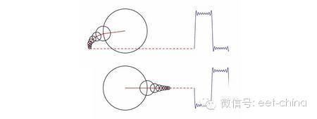 思考这个问题,还有一种由马修·亨德森( Matthew Henderson or Matthen)提供的方法。他是剑桥大学的博士生,并且对于创建数学动画模型非常有兴趣。他用圆形而不是正弦曲线来解释傅里叶变换。这种方法包含了一组不同大小的源,每个圆的圆心都在一个更大的圆的边缘上。然后,这些圆开始转动,大圆在小圆的周围摆动,小圆的运动速度大于大圆。如果你追踪最小圆上一个点的运动轨迹,如下面的动画和截图所示,你可以重建任意形状的波形。傅里叶变换再一次告诉你波形是怎样产生的:以怎样的速度去移动哪些圆。如果你年纪够大以至于你用过呼吸量描记仪,那么通过层叠的齿轮来描述复杂模型的想法你可能很熟悉。LucasVB在同一个动画上制作了互动的版本,使得你可以随意改变圆圈的大小。