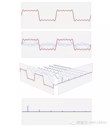 那么,现在让我们来看看输入一个方形波,经过傅里叶变换后,会输出怎样的波形。在这些图形中(点击这里可查看 GIF 动态图),红色的方形波被分离为单纯波形的集合(蓝色的正弦曲线)。将这些蓝色波形认为是红色波形的数学成分列表。在这个比喻中,傅里叶变换就像是一种药方——他准确地告诉你要重建原始波形,每一种简单波形你要使用多少。动画中的垂直蓝色线,是每种波形数量的直观表示。