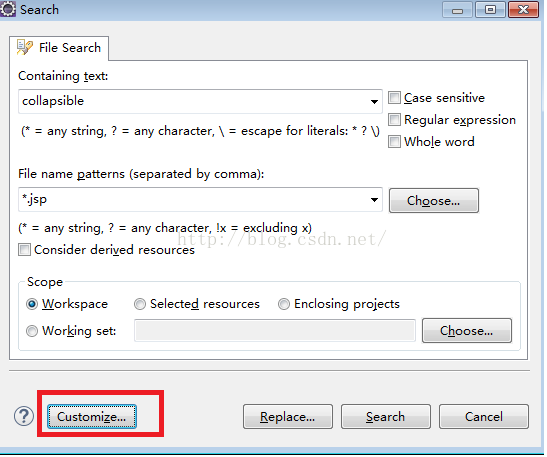 使用Ctrl + H调出搜索视图后,点击Customize。