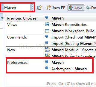输入Ctrl + 3,就可以使用Quick Access了。比如说,你想为Eclipse配置Maven环境,通常你都需要点击WindowàPreferencesàMaven,有了Quick Access,你只需要直接输入Maven即可。
