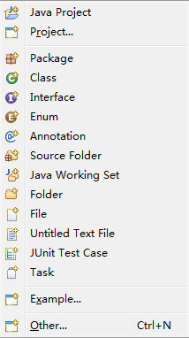 例如要在当前文件所在的包中,创建一个新的类,可以使用Alt + Shift + N,调出创建视图,选择相关类型即可。