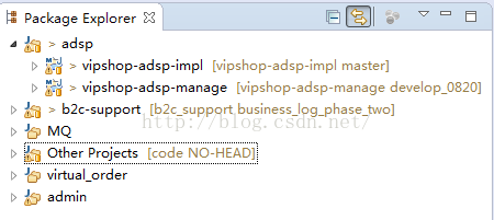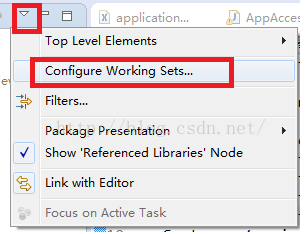 例如我把广告系统的工程放到adsp工作集中。把admin域的代码放到admin工作集中。要做到这一点,第一步是将”Top Level Elements”指定为”Working Sets”,然后点击”Configure Working Sets”进行工作集创建。