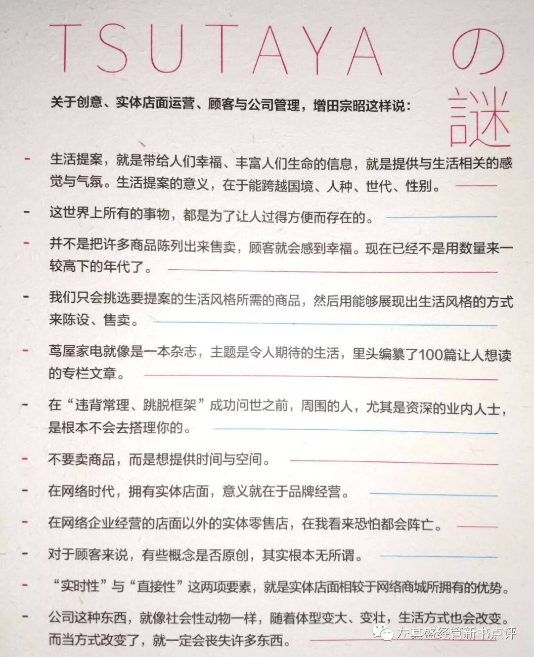 1:增田:其实我的追求从1985年在大阪枚方市创办CCC起,就一直没变过。那就是,CCC必须成为“全球第一的企划公司”。不是书店,不是唱片行,也不是影音出租店,卖企划才是CCC的本行。书籍、音乐都只是实践它的方法。所以茑屋家电其实就是CCC想出的新企划,一家“以家电为主的新型商店”. P5