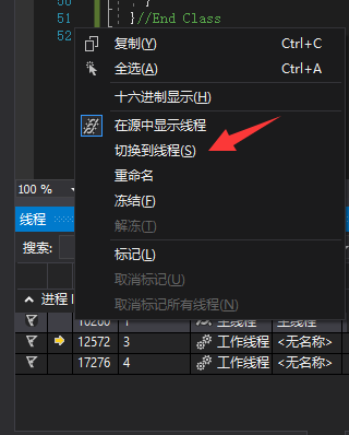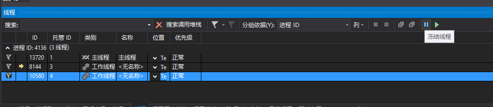 这时候我们可以单独冻结一个线程,让这个线程被单独挂起,其它线程继续调试,选择线程,然后点这里: