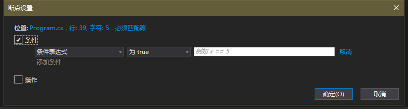 可以输入一条表达式,以表达式的结果决定是否触发,表达式参数可以是当前断点作用域内的变量或常量,判断方式有两种: