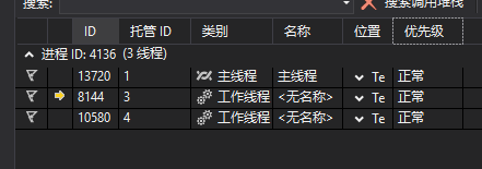 按住Ctrl键不放,接着连续按D T键,能显示[线程]窗口,可从中看到当前调试进程的所有线程。