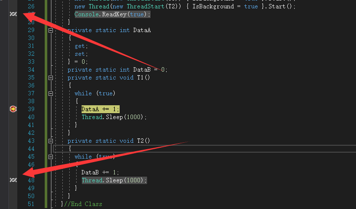 看图中左边的小箭头,其实是能拖动的!可以把他往上或往下拖,从而改变线程下一步要执行的代码位置,但是有两点要注意: