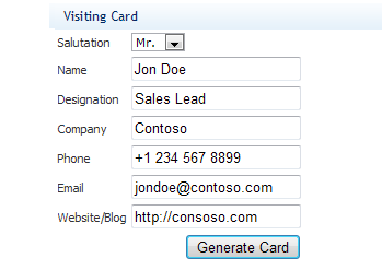 We will add a couple of panels – one with form fields to collect user data and another with a customized view to display the visiting card with user information. In the code behind for the User Control, we will add button click handlers to collect the data entered by the user and display them in a predefined visiting card panel.