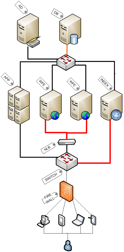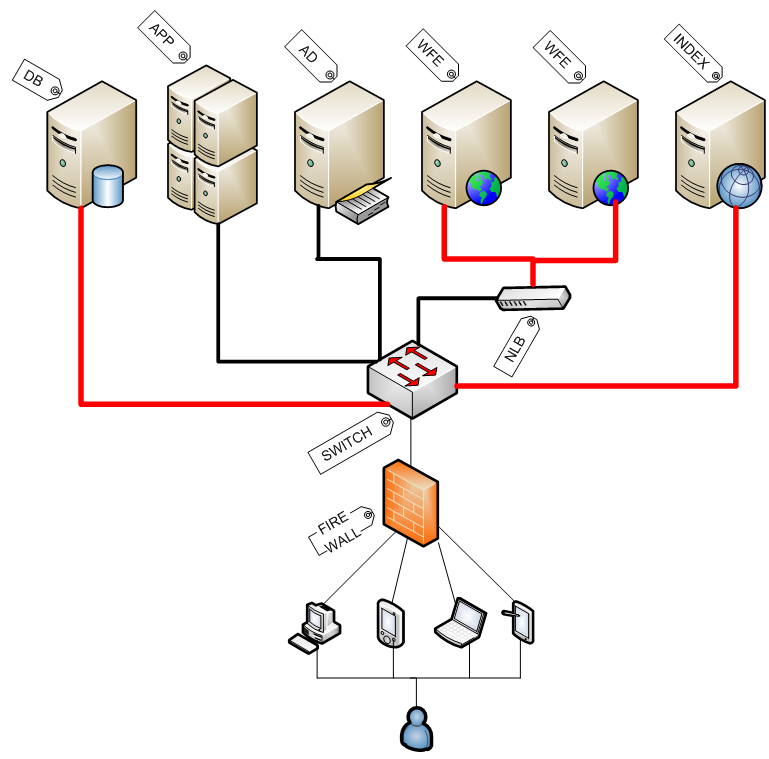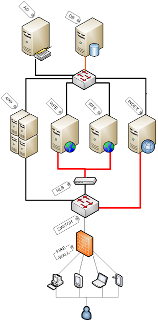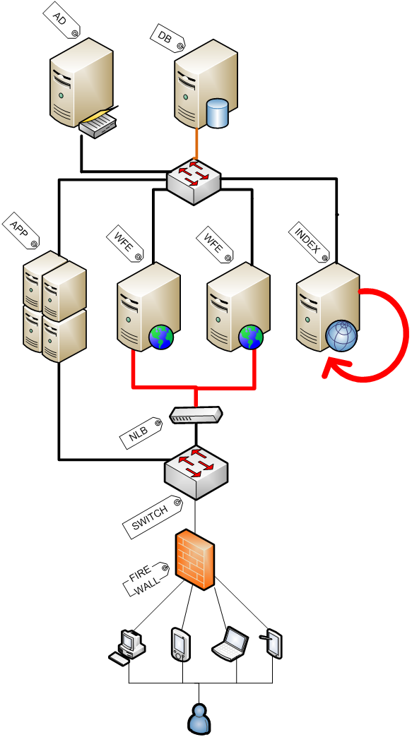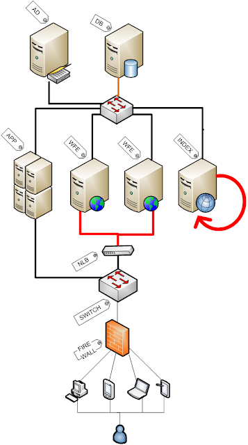 Even better, set aside an index server in the farm and let it crawl itself without having to take traffic across the front-end servers, as shown below: