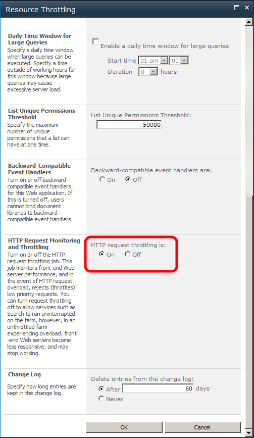 HTTP Request Throttling, which is on by default, monitors front-end server performance and in the event of HTTP request overload, rejects low priority requests when the threshold is reached. This is particularly useful for public facing web sites where there are more chances for DDOS kind of attacks.